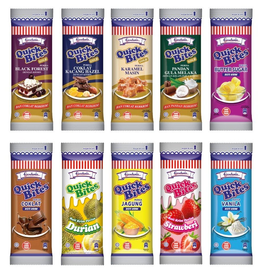 Gardenia QuickBites Gold Roti Krim Black Forest / Karamel Masin / Coklat Kacang Hazel / Pandan Gula Melaka, Gardenia QuickBites Roti Krim Jagung / Vanila / Butter Sugar / Coklat / Strawberi / Durian
